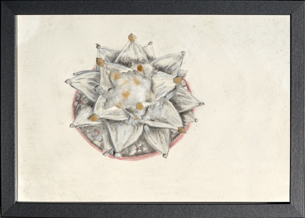 Die Komposition kombiniert wissenschaftliche Genauigkeit mit einer sanften Leichtigkeit. Die subtilen Schattierungen erzeugen eine realistische Darstellung, die nahezu ohne Farbe auskommt. Dieses Kunstwerk lädt Sie dazu ein, die außergewöhnliche Schönheit des Ariocarpus auf einer sinnlichen Ebene zu erleben – eine einzigartige Verbindung von Wissenschaft und Ästhetik.