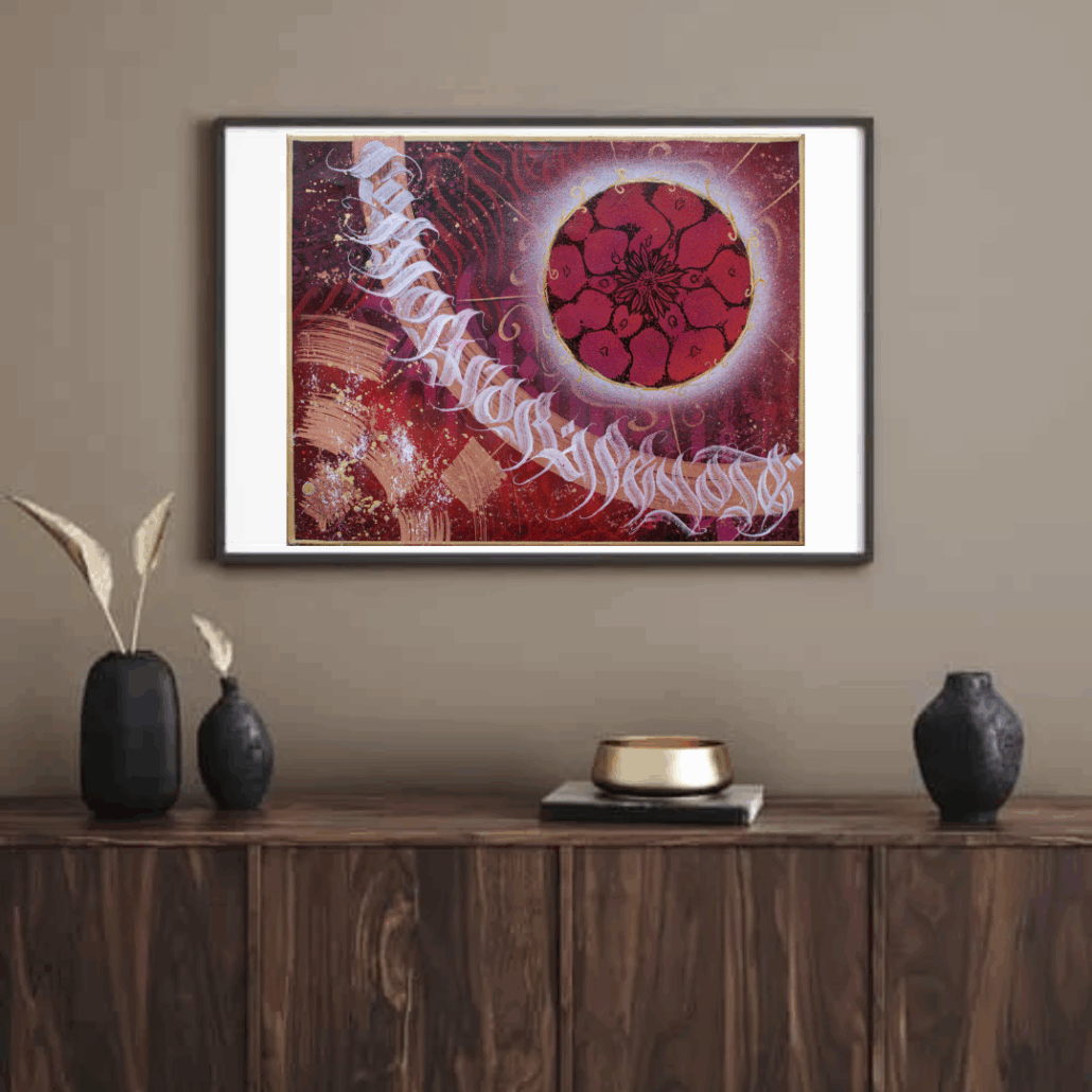 Das Kunstwerk „Kalligraphische Resonanz“ (Bild Nr. 3) ist ein signiertes Unikat von callimaya.art (aka Ethnopaul). Es kombiniert auf einzigartige Weise präzise Kalligraphie mit vielschichtiger psychedelischer Kunst und lädt den Betrachter ein, in eine Welt voller Details und Ebenen einzutauchen.