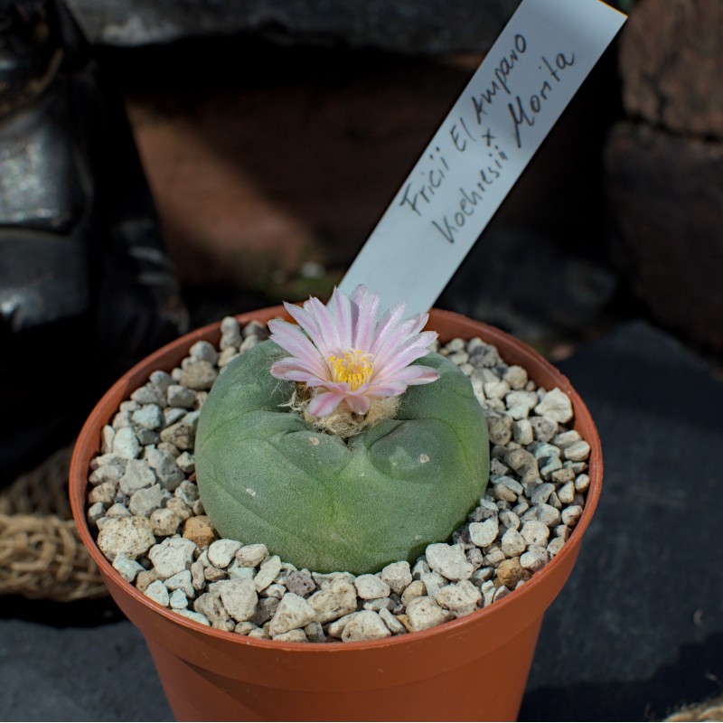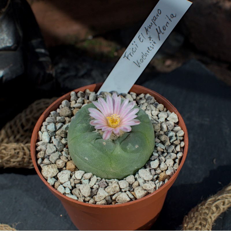 Sie erhalten eine kerngesunde, blühfähige Lophophora Hybride aus der Kreuzung L. koehresii (Morita) x L. fricii (El Amparo). Diese 100% wurzelechten Pflanzen sind aus unserer eigenen Samenzucht, bereits gut 8-9 Jahre alt und haben eine starke Rübenwurzel entwickelt.
