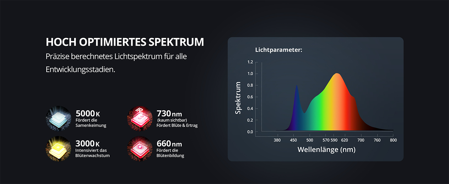 Eine exakte Mischung aus warmweißen, kaltweißen und gezielten roten Lichtanteilen imitiert das Sonnenlicht und optimiert das Wachstum.
