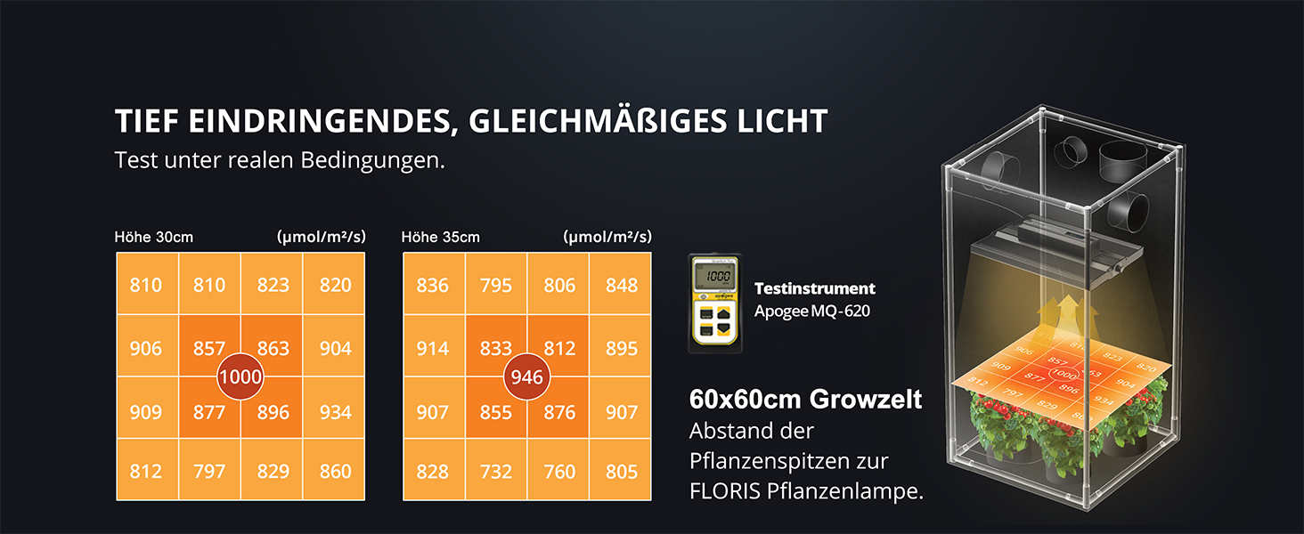 Zentraler Messwert: 1000 µmol/(s·m²) Mittelwert im Kernbereich (30×30 cm): 873 µmol/(s·m²) Mittelwert auf der Gesamtfläche (60×60 cm): 856 µmol/(s·m²) Ergebnis: Sie bieten Ihren Pflanzen mehr als das Zweifache der Lichtintensität, die für ein ideales Wachstum benötigt wird!