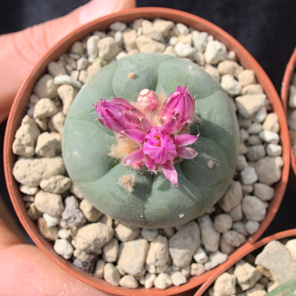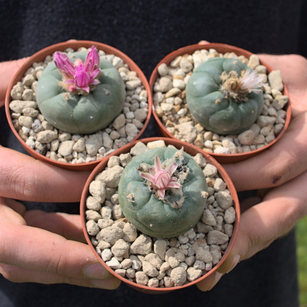 Lophophora koehresii Blüten-Trio – Exklusiver Mix: Lila, Weiß & Variabel