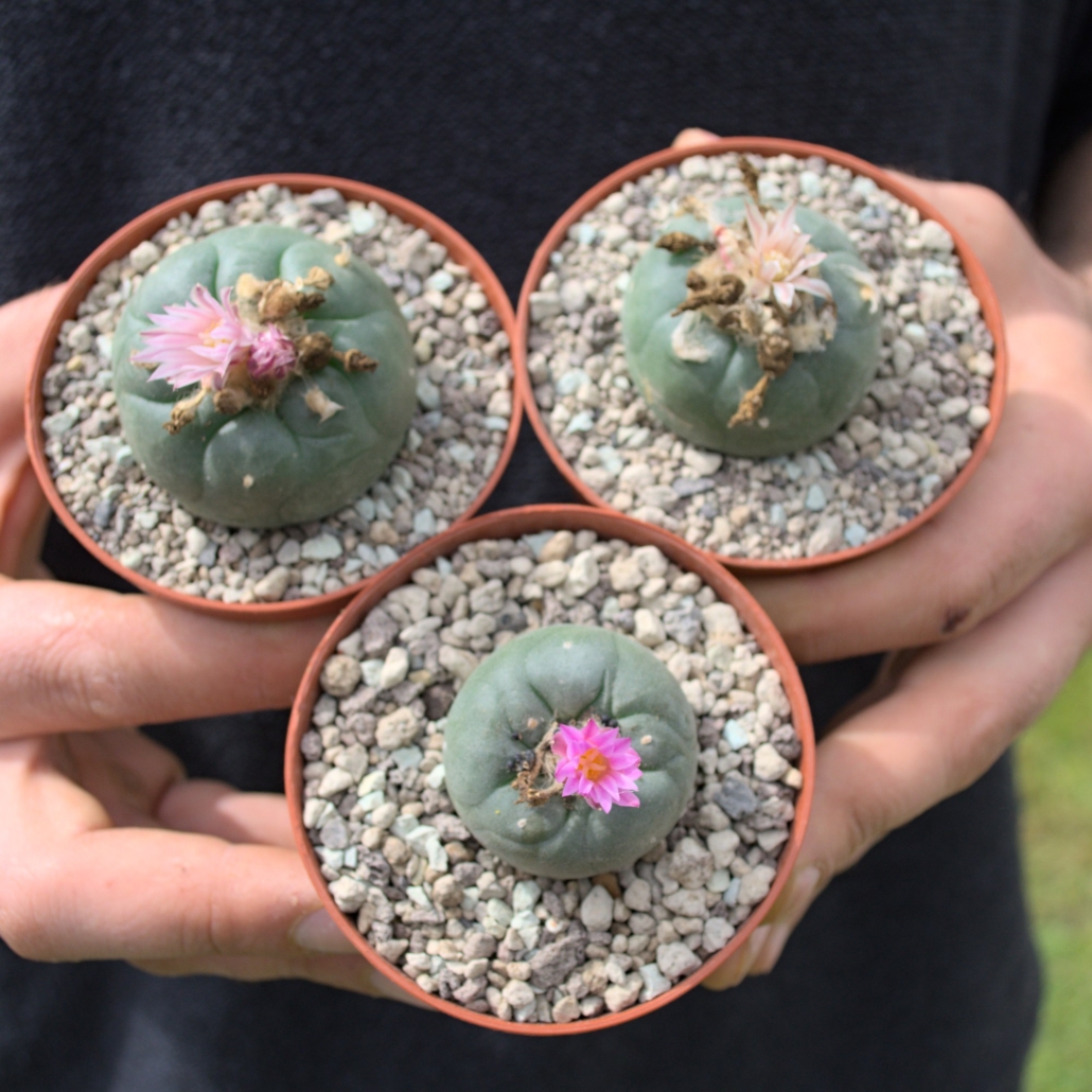 Lophophora koehresii Blüten-Trio – Exklusiver Mix: Lila, Weiß & Variabel