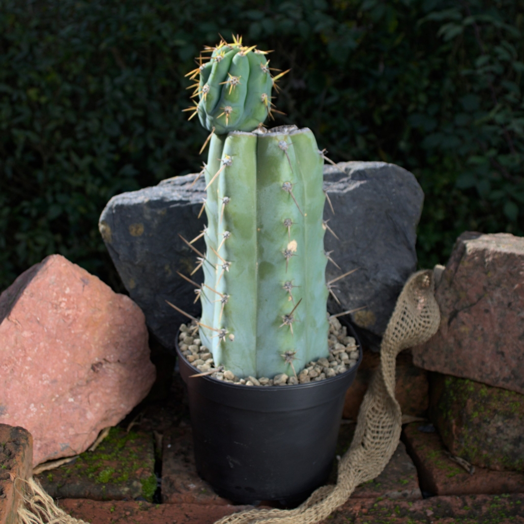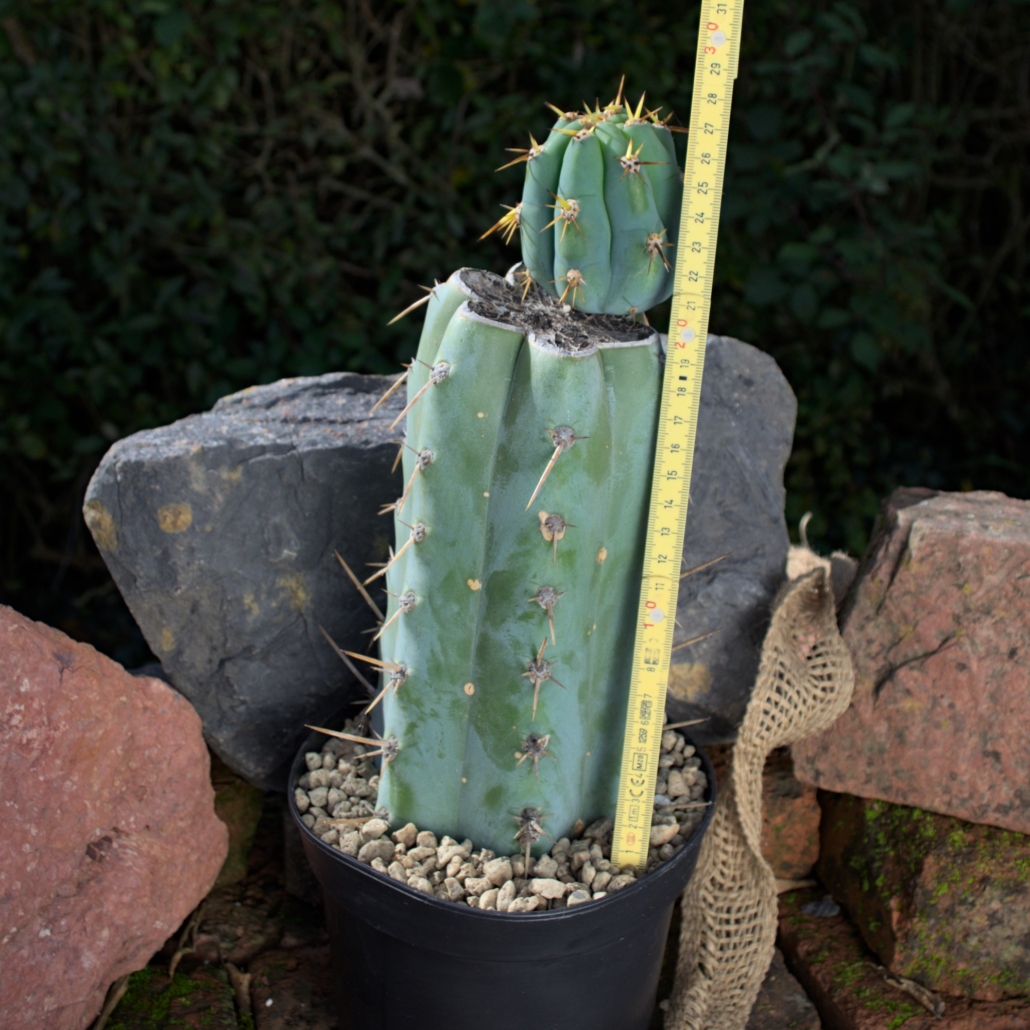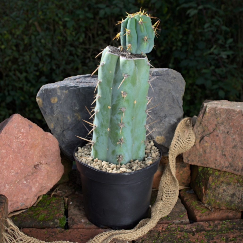 Hier bekommst du einen stattlichen, bereits bewurzelten und eingetopften Kopfsteckling des blauen Peruaners (Trichocereus peruvianus).
