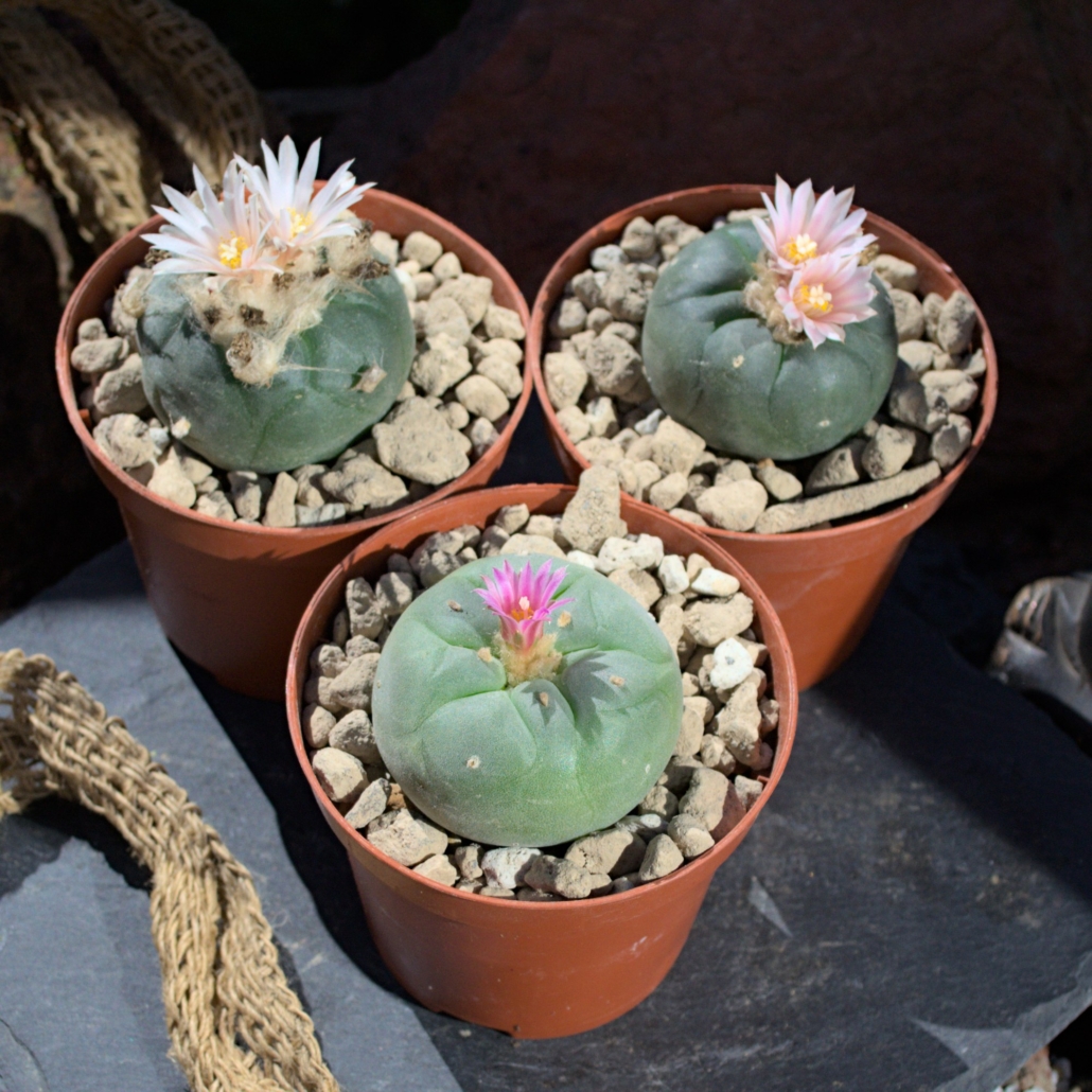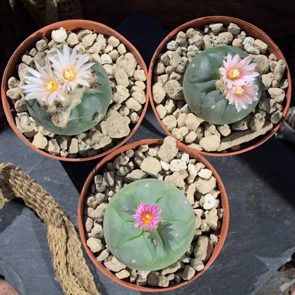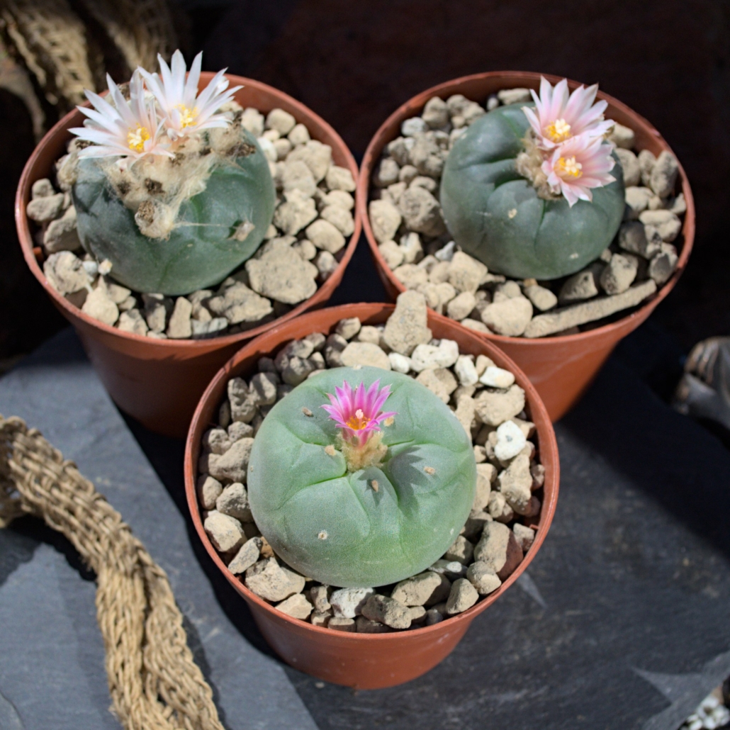 Inhalt: 1x Lophophora fricii (ca. 5,0 cm), 2x Lophophora koehresii (ca. 4,5 cm und 5,0 cm)