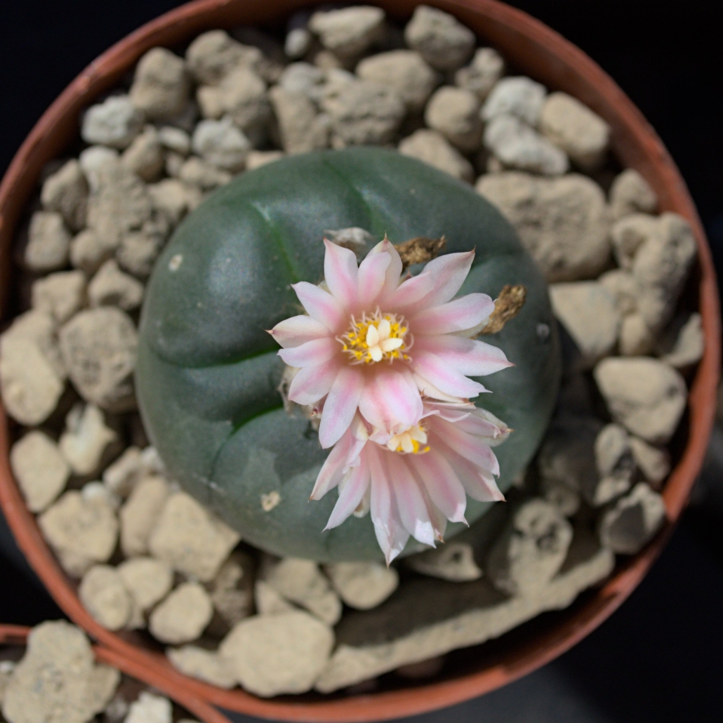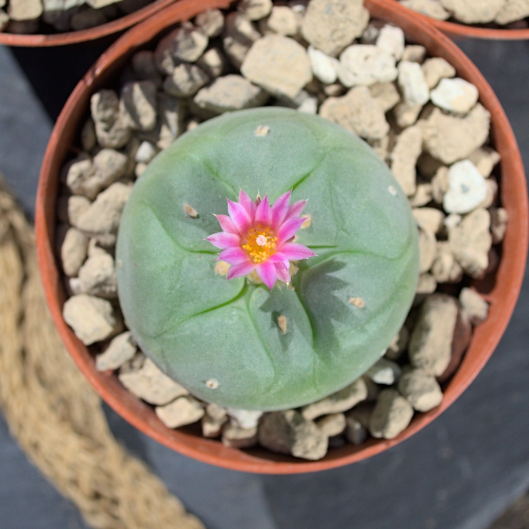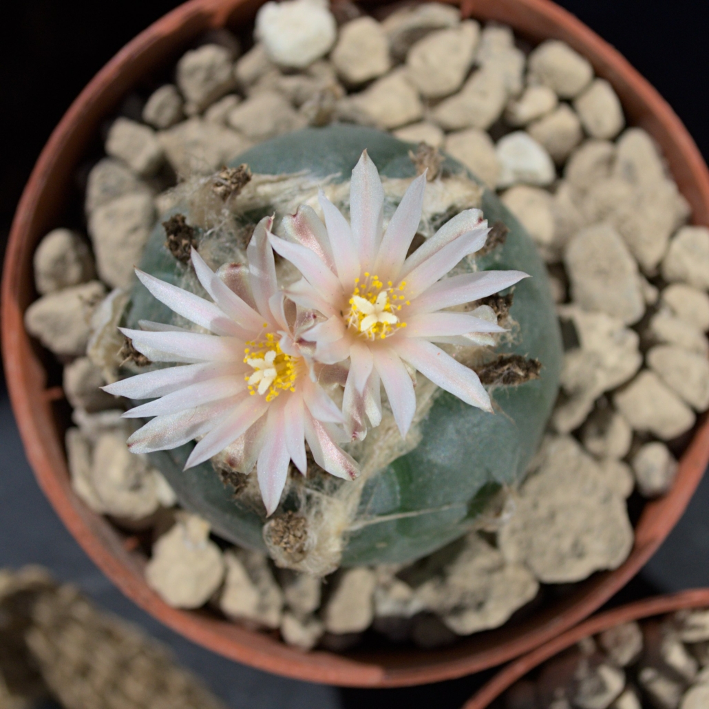 Inhalt: 1x Lophophora fricii (ca. 5,0 cm), 2x Lophophora koehresii (ca. 4,5 cm und 5,0 cm)